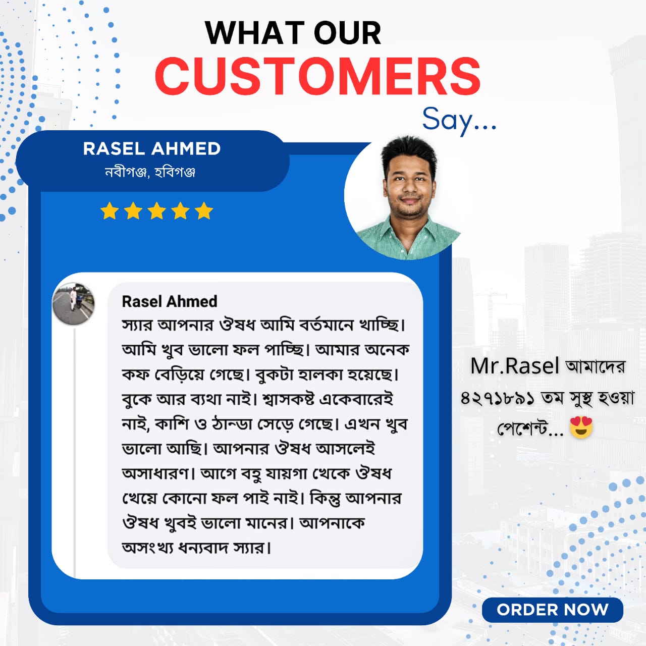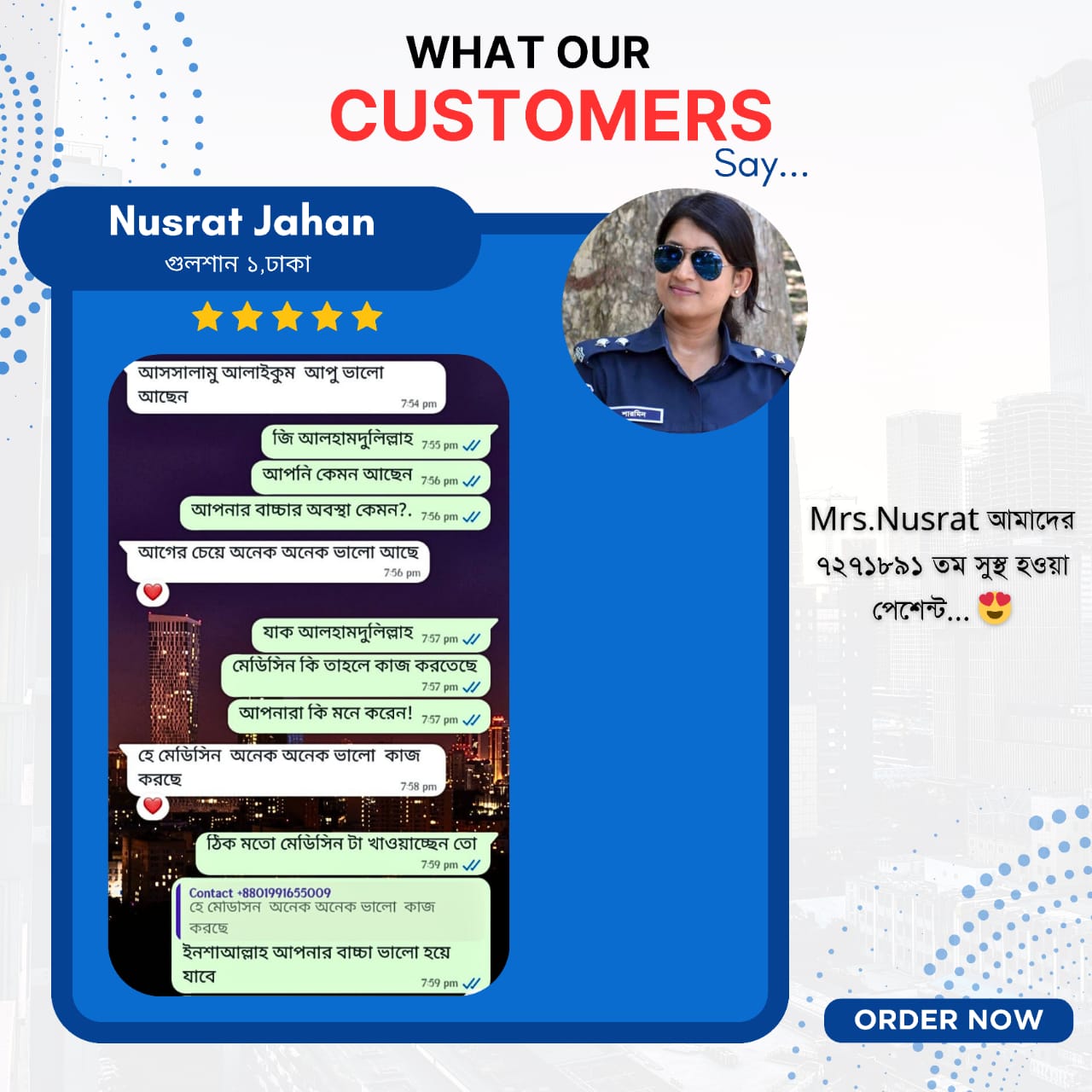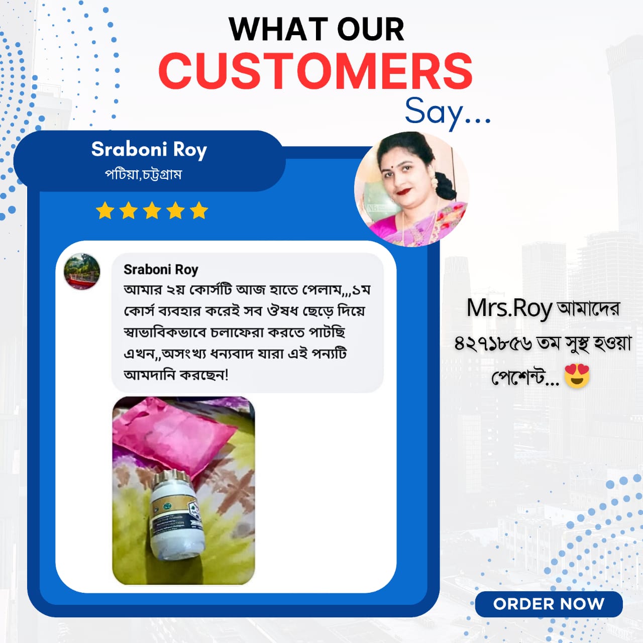 গত ১১ বছরে আমাদের প্রোডাক্ট লক্ষাধিক রোগীকে সুস্থ করেছে। সাবেক তথ্য সচিব, ক্রীড়া প্রতিমন্ত্রী, ইসলামী ব্যাংকের MD, নুসরাত ফারিয়ার মা এবং ক্রিকেটার সাব্বির রহমানের বাবার মতো বিশিষ্টজনেরা আমাদের ওষুধ ব্যবহার করে সুস্থ হয়েছেন।আপনি কেন হবেন না?