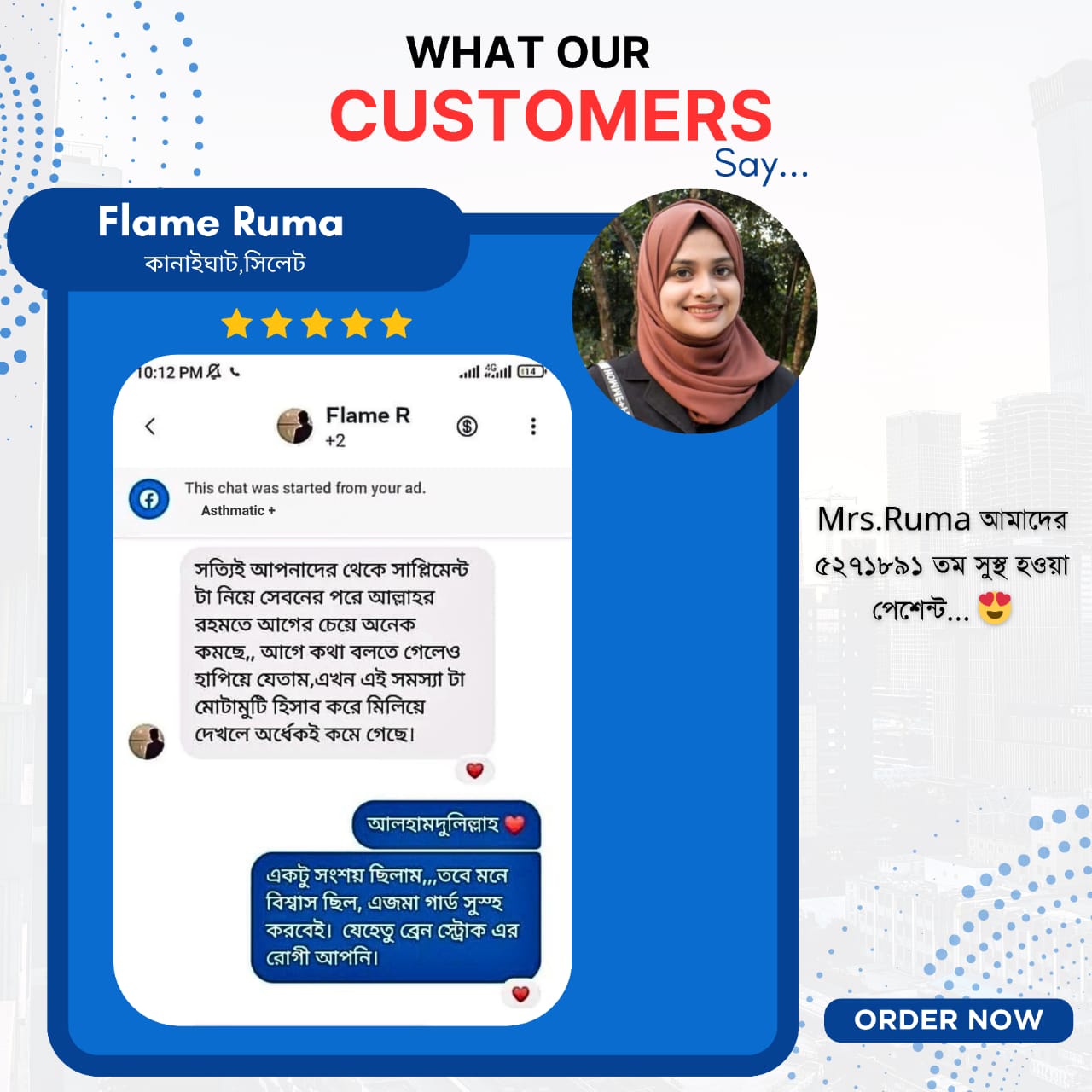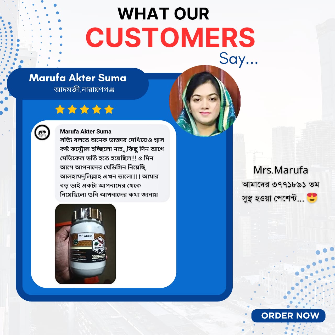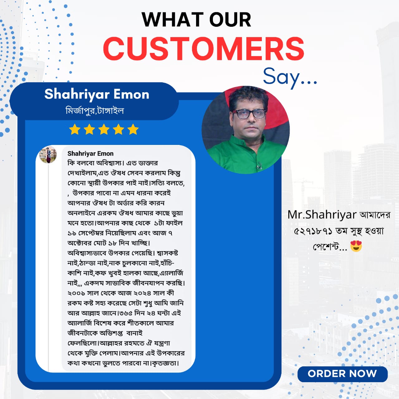 গত ১১ বছরে আমাদের প্রোডাক্ট লক্ষাধিক রোগীকে সুস্থ করেছে। সাবেক তথ্য সচিব, ক্রীড়া প্রতিমন্ত্রী, ইসলামী ব্যাংকের MD, নুসরাত ফারিয়ার মা এবং ক্রিকেটার সাব্বির রহমানের বাবার মতো বিশিষ্টজনেরা আমাদের ওষুধ ব্যবহার করে সুস্থ হয়েছেন।আপনি কেন হবেন না?